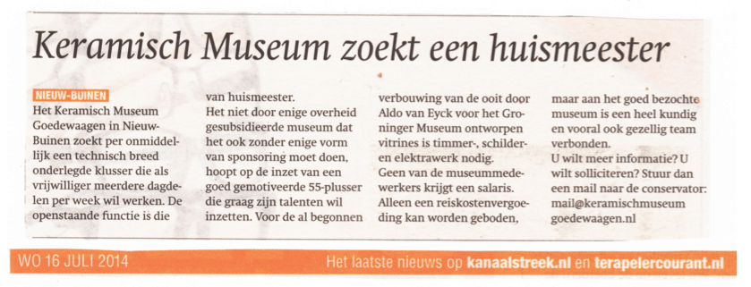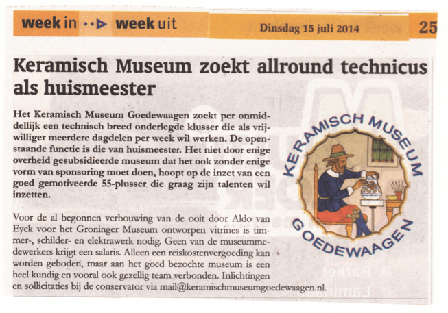 - Keramisch Museum zoekt allround technicus als huismeester, Week-in, Week-uit, 15-07-2014